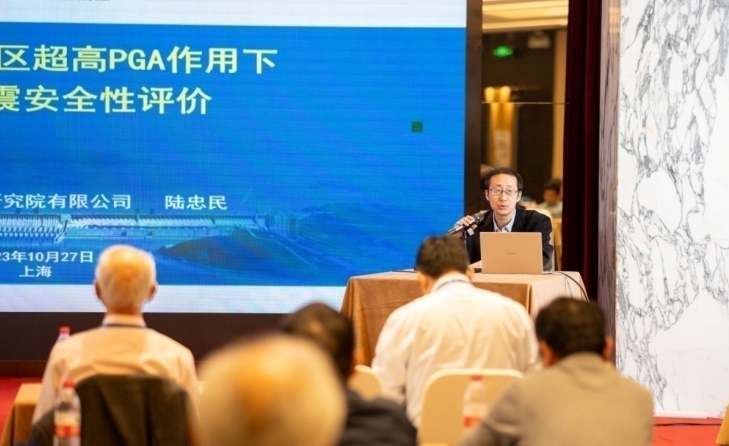 上海勘測設計研究院首席專業師陸忠民以“近活動斷層區超高PGA作用下大壩抗震安全評價”為題,彙報了近活動斷層區超高PGA甘肅黃羊抽水蓄能電站上庫瀝青混凝土麵板堆石壩和下庫碾壓混凝土重力壩抗震分析和安全評價成果。