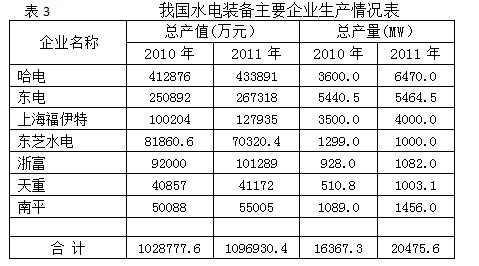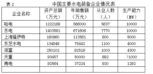 我國大中型水電機組製造廠家包括各類所有製形式的生產企業共十餘家。其中,哈爾濱電機廠有限責任公司(簡稱哈電)和東方電機股份有限公司(簡稱東電)規模最大,是我國研製大型發電設備的基地。他們建廠曆史久遠,綜合能力強,設計和科研水平高,為我國大多數大中型水電工程提供了高質量的水電裝備,屬全國大型發電設備製造的重點骨幹企業。中外合資企業中的上海福依特水電設備有限公司(簡稱上海福依特)、東芝水電設備(杭州)有限公司(簡稱“東芝水電”)和天津阿爾斯通水電設備有限公司(簡稱天津ALSTOM)規模也比較大,設計製造技術水平高,在我國水電裝備市場上有著很強的競爭力。其他企業如:浙江富春江水電設備股份有限公司(簡稱浙富)、天津市天發重型水電設備製造有限公司(簡稱天重)、福建南電股份有限公司(簡稱南電)、重慶水輪機廠有限責任公司(簡稱重水)等,則各具特色,在我國水電裝備市場(特別是中小型水電裝備市場)上,也具有一定的競爭力,是我國眾多中小型水電工程優質、可靠發電機組設備的主要來源。至2011年底,以上所述水電裝備製造企業從業人數已超過20000人,年銷售額約180億元,年生產能力超過4000萬千瓦。