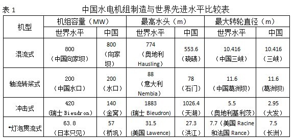 我國水電裝備各種機型機組與世界先進水平的比較情況見表1。從表1可見,我國的混流式、軸流轉槳式和燈泡貫流式水電機組的製造水平已經達到世界先進水平,但應用水頭方麵尚有差距;衝擊式水電機組較世界先進水平有較大差距。從總體上看,我國水電裝備水平已步入世界先進行列。