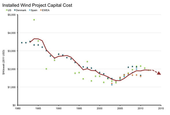 風力渦輪機的成本也已經大幅下降。