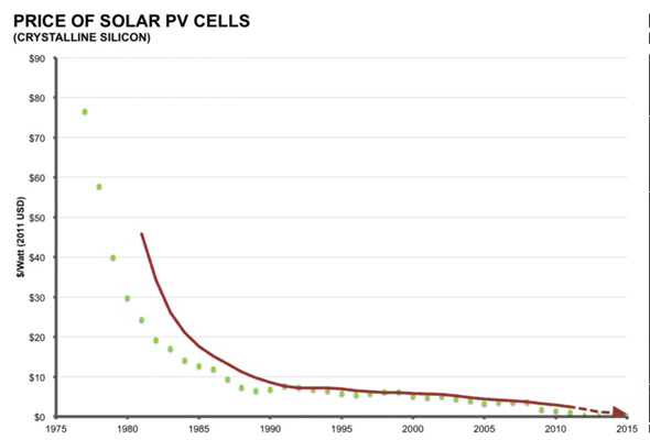 而最大的成就是太陽能。太陽能板的成本在過去三十年中已經下降了超過99%,從1977年的每瓦超過75美元下降到現如今的每瓦50美分。