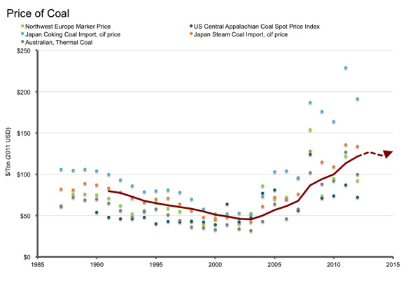 與此同時,由於我們已經燃燒了大部分最容易獲取的能源儲備,化石燃料價格持續上漲。煤炭價格也一直穩步升高。