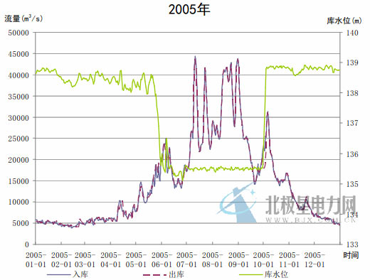 圖2-3 2005 年三峽水庫庫水位及出入庫流量過程線
