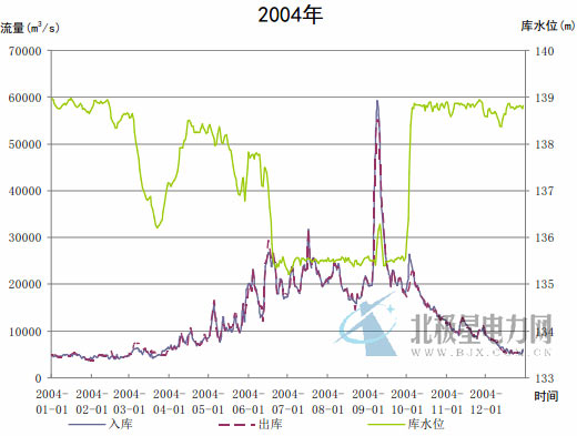 圖2-2 2004 年三峽水庫庫水位及出入庫流量過程線