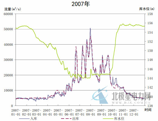 圖2-5 2007 年三峽水庫庫水位及出入庫流量過程線