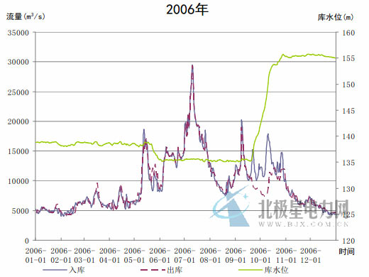 圖2-4 2006 年三峽水庫庫水位及出入庫流量過程線