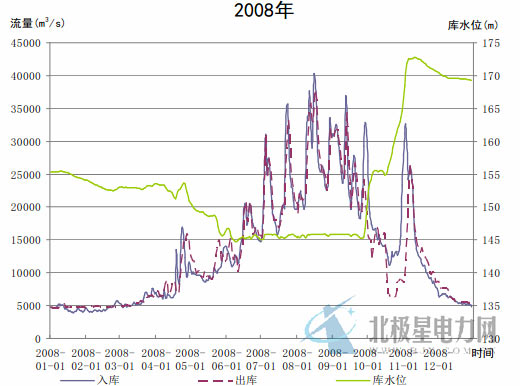 圖2-6 2008 年三峽水庫庫水位及出入庫流量過程線