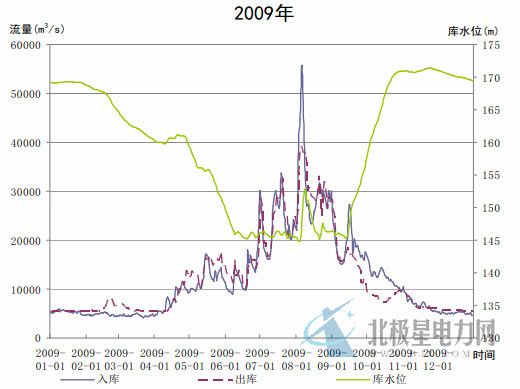 圖2-7 2009 年三峽水庫庫水位及出入庫流量過程線