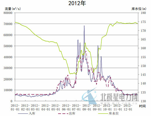 最大瞬時入庫流量71200 m3/s ,出現在 2012 年7 月24 日20時;最小瞬時入庫流量3450 m3/s ,出現在 2012年2 月17日14時。