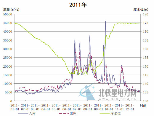 圖2-9 2011 年三峽水庫庫水位及出入庫流量過程線