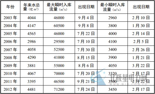 2003年~2012 年,三峽年均來水量3991億m3,較初步設計報告的多年均值(187 7 年~1990年)4510億m3偏少11 . 5 % 。其中,年最大來水量 4565 億m3,出現在2005 年;年最小來水量2986 億m3,出現在2006 年。最大瞬時入庫流量 712 00 m3/s ,出現在2012 年7 月24日20時;最小瞬時入庫流量2960 m3/s ,出現在2003 年2 月10日14時。