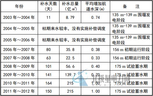 2008年~2009年枯水期,三峽水庫分別於 2008年12月19日~2009 年1 月5 日和2009 年1 月18 日~4 月10 日實施了航運補償調度。補水日數共 101 天,補水總量 56.6 億m3,平均增加航道水深約 0.4m。