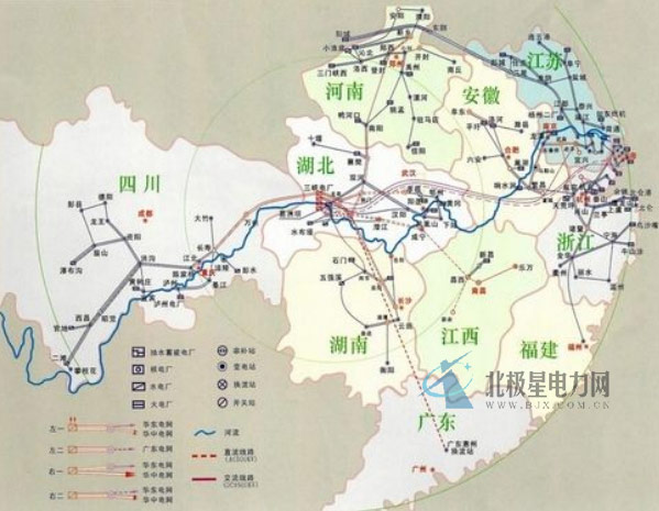 三峽電站安裝 32 台單機額定功率 70 萬 kW(單機最大容量75.6 萬 kW)的水輪發電機組,其中左岸電站 14 台,右岸電站 12台,地下電站6台;另外,電源電站(為三峽電站廠用及樞紐永久建築物供電電源)裝設2 台5 萬kW的水輪發電機組, 額定總裝機容量2250 萬kW,是全球裝機容量最大的水電站。三峽電站多年平均發電量882 億kW?h, 年最大發電量可超過1000 億kW?h,是我國西電東送和南北互供的骨幹電源點,為華中、華東和南方等十省市(包括湖北、湖南、河南、江西、上海、江蘇、浙江、安徽 、廣東、重慶等省市)的經濟發展提供優質的清潔能源,在電網穩定中發揮著重要作用。三峽電站輸變電線路圖詳見圖3-1。