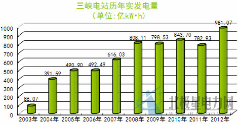 2012年,通過精益運行、精心維護和精確調度,三峽電站年發電981 億kW?h,創曆史新高,約占全國水力發電總量的14%。2003 年~2012 年,三峽電站累計發電量超過 6291 億 kW?h(三峽電站曆年實發電量詳見圖3-2),有效緩解了華中、華東地區及廣東省的用電緊張局麵,支援了國民經濟的發展。