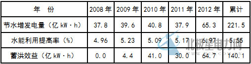 為提高電站的綜合發電效益,三峽電站根據機組運行工況及上遊實際來水情況,采取了節水調度等一係列優化措施,增加發電量。2008 年~2012 年,節水增發電量為 221.5 億 kW˙h,水能利用提高率達 5.55%,其中汛期累計滯洪調度增發電量 140.1 億kW˙h(詳見表3-2) 。