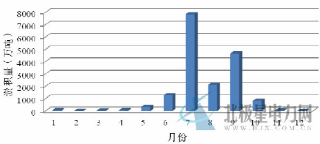 由於三峽入庫泥沙較初步設計值大幅減小,三峽庫區泥沙淤積大為減輕。根據三峽水庫入庫與出庫沙量之差,在不考慮區間來沙的情況下, 2003 年6 月~2012 年12 月,水庫泥沙淤積14.37億t,近似年均淤積1.44 億t,僅為論證階段的39%左右,水庫排沙比為 24.4%。2012 年,三峽庫區泥沙淤積 1.74 億 t,水庫排沙比為20.7%。三峽水庫2012 年逐月淤積量如圖5-1所示。