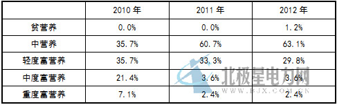 三峽庫區水華監測網絡建立以後,2010 年4 月開始,對庫區重點支流開展營養狀況評價。水體綜合營養狀況評價執行中國環境監測總站製定的"湖泊(水庫)富營養化評價方法及分級技術規定"。評價結果表明:2011 年、2012 年,庫區主要支流水體以中營養狀態為主,所占比例分別為71.5%、76.4%。時間分布上,支流富營養化主要發生在消落期和汛期,汛期較為嚴重;空間分布上,重慶庫區和湖北庫區支流發生富營養化的概率沒有顯著差異。2010 年~2012年,4 月~10 月營養狀態統計結果見表5-3,近年來庫區支流營養狀態有所好轉。