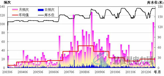 135m蓄水後(2003年~2005 年)平均每年發生水華14 起,156m蓄水後(2006年~2007 年)平均每年發生水華26 起, 175m試驗性蓄水以來(2008 年~2012 年),平均每年發生水華13起。