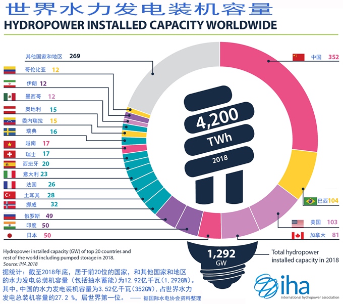 據統計:截至2018年年底,居於前20位的國家,與其他國家和地區的水力發電裝機容量(包括抽水蓄能)為12.92億千瓦(1,292GW)。其中,中國的水力發電裝機容量為3.52億千瓦(352GW),占世界水力發電總裝機容量的27.2%,居世界第一位。 ——根據國際水電協會資料整理