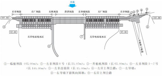 三峽水利樞紐主要由大壩、電站廠房、通航建築物和茅坪溪防護壩組成。從左岸至右岸,樞紐建築物布置依次為:船閘,垂直升船機,左岸非溢流壩段和電源電站,左岸電站,泄洪壩段,右岸電站,右岸非溢流壩段,右岸地下電站(見圖1-1) 。