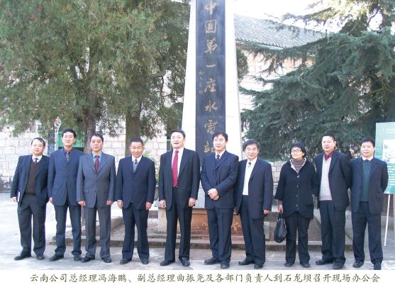 12 月8 日,中共雲南省委常委、昆明市委書記仇和,昆明市市長張祖林,昆明市委、 市政府、市人大、市政協領導班子以及相關單位近80 餘人到石龍壩發電廠進行工作調研。 希望華電雲南公司肩負起曆史責任,加強環境整治,進一步把文物電站保護好、管理好、 運行好,將“石龍壩”品牌發揚光大,爭取早日建成雲南水電博物館,做成全國的王牌。
