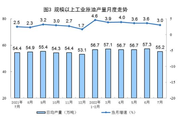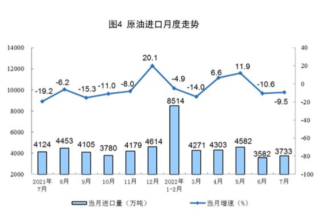 1—7月份,生產原油12000萬噸,同比增長3.7%。進口原油28984萬噸,同比下降4.0%。