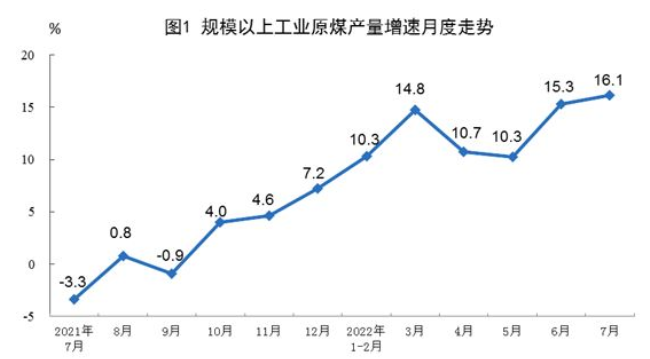 原煤生產增速加快,進口降幅收窄。7月份,生產原煤3.7億噸,同比增長16.1%,增速比上月加快0.8個百分點,日均產量1202萬噸。進口煤炭2352萬噸,同比下降22.1%,降幅比上月收窄10.9個百分點。