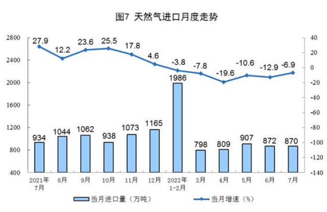 1—7月份,生產天然氣1267億立方米,同比增長5.4%。進口天然氣6221萬噸,同比下降9.6%。