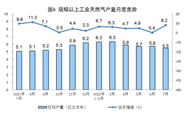 天然氣生產增速加快,進口降幅收窄。7月份,生產天然氣171億立方米,同比增長8.2%,增速比上月加快7.8個百分點,日均產量5.5億立方米。進口天然氣870萬噸,同比下降6.9%,降幅比上月收窄6.0個百分點。
