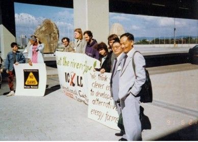 在那次會議上,有個場麵令我們大開眼界,在聯合國的會議大廳外麵,反水壩的團體組織了一些人,搭建了不少帳篷並且住在那裏。每天當有開會代表來到會場時,他們都會擺出反對建水壩和讓河流自由流淌的標語牌。這些人的抗議行為,不僅平靜,而且還非常文雅。經我們與其中的一些示威者私下交談之後才得知,他們大部分都是反壩組織專門花錢雇用來的學生。他們的目的不是真要抗議建壩,而不過是想掙點錢。這種情況到和我們今天國內眾多的環保組織非常相似。它們並不大了解水電大壩,他們反壩的目的,主要是為了能得到資助和名、利。得知這一情況之後,從來也不愛照相的潘院士,連忙讓我給他和這些反壩示威者一起拍張照片。這張照片後來也曾被潘院士用於他的《千秋功罪話水壩》一書中。
