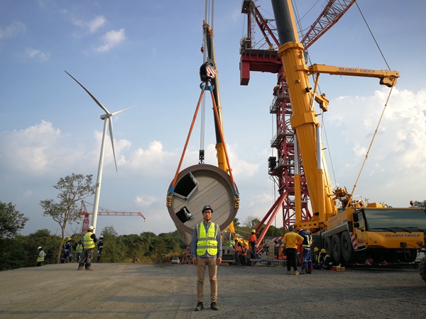 2. 2015年他調入中國電建中南院在中南亞泰國開始新的領域風電總承包項目管理。2016年他擔任泰國GNP風電總承包項目經理,該項目塔筒高度為153米,為目前已完成項目世界上高度最高鋼製塔筒,行業無可借鑒吊裝經驗吊裝難度極高,而且項目風機主件及塔筒都是從中國采購經過長途海運到達泰國,項目大部件設備的超限、超高、超重等特點導致運輸難度增大、貨損率風險增加以及相關EPC合同條款要求物流批次多、大部件發運量大、運輸集中且多次轉運及短倒成為了項目另外一個技術難點。