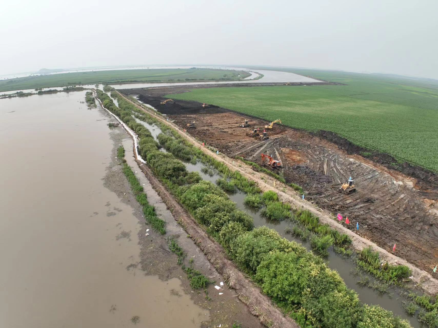 受持續降水影響,烏蘇裏江幹流發生有實測資料以來最大洪水,受上遊來水影響,撓力河發生河水倒灌,河段堤壩原壩被衝毀,萬畝良田麵臨被淹風險。水電基礎局黑龍江項目立即組織10餘台大型機械設備,奔赴現場搶險,經過七天日夜鏖戰,終於將洪水擋在了子堤之外,消除了水災風險。