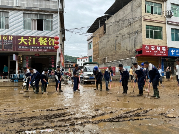 水電一局貴州羅甸羅蘇光伏項目所在地遭遇極端暴雨天氣,降雨量高達209.5毫米,鄉鎮街道發生洪水及泥石流災害,項目部第一時間聞“汛”而動,迅速集結黨員、共青團員成立道路搶險先鋒隊,投身到街道抗洪搶險保民生治理行動中。