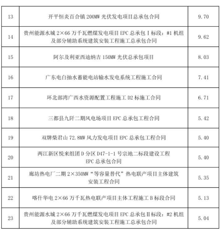 注: 1.能源電力業務包括水電、風電、太陽能發電、火電、電網等; 2.水資源與環境業務包括水利、水務、水環境治理和水生態修複等; 3.城市建設與基礎設施業務包括市政、房建、鐵路、城市軌道交通、公路、機場、港口 與航道等; 4.其他業務指除以上三項業務外的業務; 5.上表中分項數據加總之和與合計數之間的差異係四舍五入原因所致。