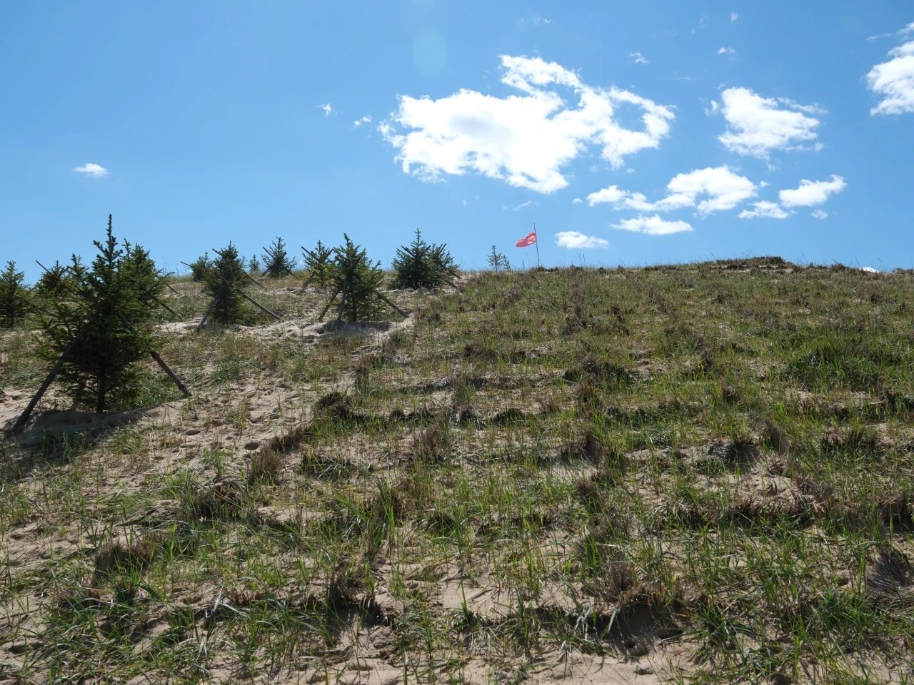 ▲ 渾善達克-科爾沁沙地南緣治理項目上,排列整齊的草方格沙障為種植的草木提供一道保護屏障。攝影:黃克瑤