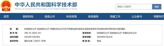 為深入學習貫徹黨的二十大精神,全麵落實中共中央辦公廳、國務院辦公廳《關於進一步弘揚科學家精神加強作風和學風建設的意見》《關於進一步加強科研誠信建設的若幹意見》要求,推動和引導科技類社會團體更好發揮學術自律自淨功能和作用,科技部、民政部、中國科協聯合開展科技類社會團體加強學術自律自淨專項行動。現就有關事項通知如下。