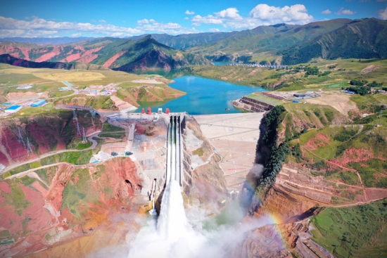 地處高原的瑪爾擋水電站,一片綠波蕩漾。下午7點以後,大西北的太陽褪去了炙熱的光芒,露出嬌媚溫柔的紅顏,羞答答地落在水麵,溢洪道泄洪的水流帶著夕陽,一瀉千裏,朝著太陽的方向奔去,在瑪爾擋的高空中盤旋著一群雄鷹,俯瞰著這個美輪美奐的“超級工程”,一首高亢響亮的“奉獻曲”在山穀間回蕩。