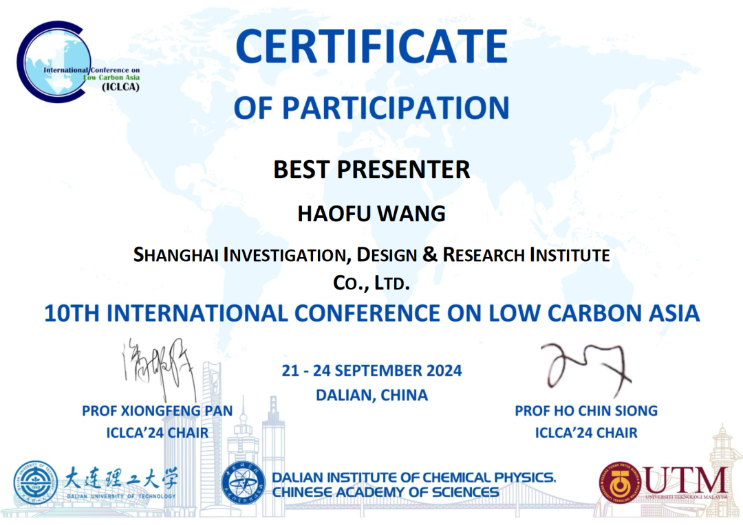 其中,青年員工王顥甫因撰寫論文《綠色氫能城市的建模與優化——以上海為例的研究》(Modelling and Optimisation in the Design of Green Hydrogen Cities - A Case Study of Shanghai)受邀進行主題演講,被評為會議最佳演講者;由青年員工佘勁草、薑書舟和李東升等撰寫的另外兩篇論文也被製作成海報展示。