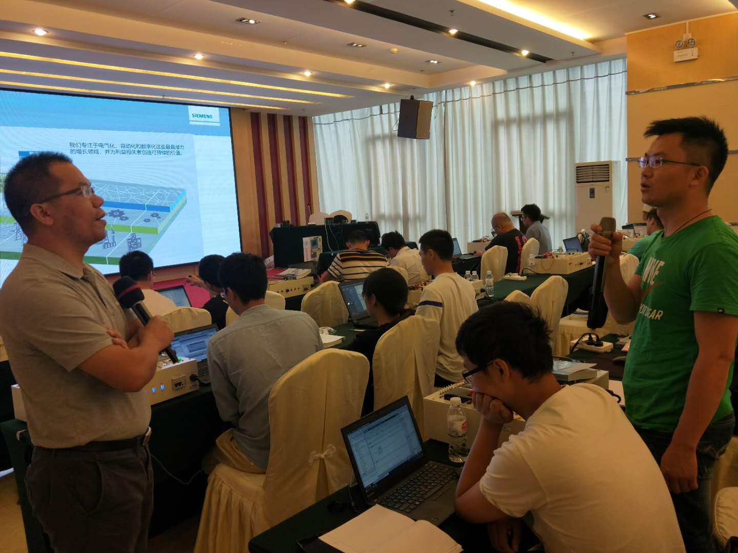 本次培訓班,邀請到了專業經驗十分豐富的廣東水利電力職業技術學院優秀講師黃誠和西門子(中國)華南區S7-1200產品經理芮慶忠擔任主講老師。黃誠老師采用理論與實際操作相結合的授課方式,就PLC基本原理、西門子產品硬件與編程軟件基礎知識、編程軟件基本指令、擴展指令及觸摸屏應用、編程軟件程序架構、數據結構等知識點進行講授。黃誠老師授課不時與學員互動,注重培養學員主動思考、善於運用舉一反三的思維能力。芮慶忠老師通過陳述和模擬演示,介紹了西門子PLC未來發展分析,就S7-1200工藝指令及通信的理解、博途編程軟件的安裝及應用、S7-1200組態下載實驗、PID實驗程序製作、MM440變頻器的控製方法及綜合應用典型案例解析等進行重點講授。在針對性的練習及互動中,更側重於培養學員的團隊協作和動手能力,使大家都能夠學懂、鞏固並完善和總結。學員們認真聽講、熱烈討論、積極互動,即使是休息時間也在探討和鑽研問題。他們認真積極的學習態度和努力探索的專業精神得到了授課老師的一致肯定和褒獎。