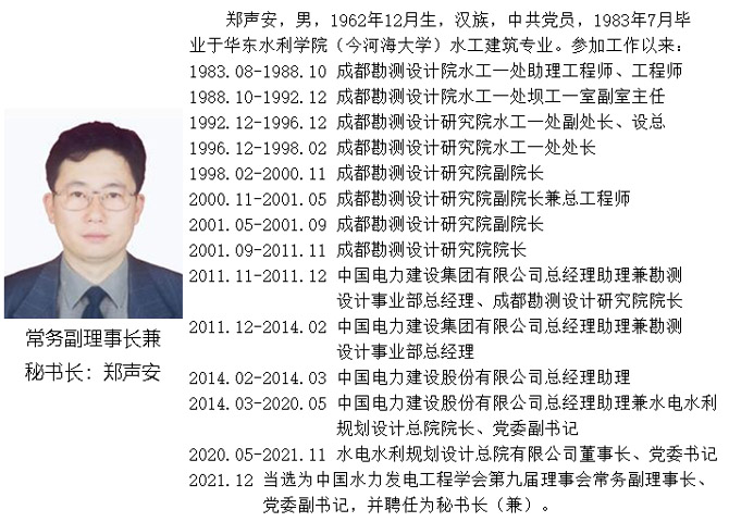 副理事長單位: 水利部(理事長單位) 國家能源局 國家開發銀行 中國電力企業聯合會 國家電網有限公司 中國南方電網有限責任公司 中國華能集團有限公司 中國華電集團有限公司 國家電力投資集團有限公司 中國長江三峽集團有限公司 國家能源投資集團有限責任公司 中國南水北調集團有限公司 國家開發投資集團有限公司 中國電力建設集團有限公司 中國能源建設集團有限公司 水電水利規劃設計總院 中國水利水電科學研究院 水利部交通運輸部國家能源局南京水利科學研究院 河海大學 常務理事單位: 中國國際工程谘詢有限公司 中國安能建設集團有限公司 清華大學 武漢大學 天津大學 四川大學 三峽大學 中國電機工程學會 潘家錚水電科技基金 南瑞集團有限公司(國網電力科學研究院有限公司) 國網新源集團有限公司 南方電網儲能股份有限公司 華能瀾滄江水電股份有限公司 華能西藏雅魯藏布江水電開發投資有限公司 廣西桂冠電力股份有限公司(龍灘水電開發有限公司) 華電雲南發電有限公司 貴州烏江水電開發有限責任公司(中國華電集團公司貴州分公司) 青海黃河上遊水電開發有限責任公司 國家電投集團雲南國際電力投資有限公司 國家電投集團五淩電力有限公司 中國長江電力股份有限公司 中國三峽建工(集團)有限公司 上海勘測設計研究院有限公司 國能大渡河流域水電開發有限公司 雅礱江流域水電開發有限公司 國投電力控股股份有限公司 哈爾濱電機廠有限責任公司 東方電氣集團東方電機有限公司 中國葛洲壩集團股份有限公司 中國電建集團北京勘測設計研究院有限公司 中國電建集團華東勘測設計研究院有限公司 中國電建集團西北勘測設計研究院有限公司 中國電建集團中南勘測設計研究院有限公司 中國電建集團成都勘測設計研究院有限公司 中國電建集團貴陽勘測設計研究院有限公司 中國電建集團昆明勘測設計研究院有限公司 中國水利水電第七工程局有限公司 中國水利水電第八工程局有限公司 中國水利水電第十四工程局有限公司 長江設計集團有限公司 理事單位: 國家能源局大壩安全監察中心 中國水利學會 中國大壩工程學會 浙江大學 大連理工大學 華中科技大學(水電與數字化工程學院) 西安理工大學 華北水利水電大學 湖北省水力發電工程學會 湖南省水力和新能源發電工程學會 廣東省水力和新能源發電工程學會 福建省水力和清潔能源發電工程學會 四川省水力發電工程學會 陝西省水力發電與新能源工程學會 青海省水力和新能源發電工程學會 英大傳媒投資集團有限公司 雲南電網有限責任公司 華能四川能源開發有限公司 中國大唐集團有限公司重慶分公司 大唐水電科學技術研究院有限公司 華電四川發電有限公司 華電金沙江上遊水電開發有限公司 國電南京自動化股份有限公司 華電西藏能源有限公司 國家能源集團西藏電力有限公司 中國中鐵股份有限公司 中國鐵建股份有限公司 中國建設基礎設施有限公司 中鐵工程裝備集團有限公司 中交第一航務工程局有限公司 中電建新能源集團股份有限公司 中國水務投資集團有限公司 中國水利水電第一工程局有限公司 中國水利水電第三工程局有限公司 中國水利水電第四工程局有限公司 中國水利水電第五工程局有限公司 中國水利水電第六工程局有限公司 中國水利水電第九工程局有限公司 中國水利水電第十工程局有限公司 中國水利水電第十一工程局有限公司 中國水利水電第十二工程局有限公司 中國電建市政建設集團有限公司(原水電十三局) 中國水利水電第十五工程局有限公司 中國水利水電第十六工程局有限公司 中國水電基礎局有限公司 中國電建集團國際工程有限公司 中國電建集團海外投資有限公司 中電建水電開發集團有限公司 中國電建集團山東電力建設有限公司 中國電建集團山東電力建設第一工程有限公司 中國電建集團江西省水電工程局有限公司 中國電力工程顧問集團有限公司 中國安能集團第一工程局有限公司 中國安能集團第二工程局有限公司 中國安能集團第三工程局有限公司 中國葛洲壩集團第一工程有限公司 中國葛洲壩集團第二工程有限公司 中國葛洲壩集團第三工程有限公司 中國葛洲壩集團三峽建設工程有限公司 水利部水利水電規劃設計總院 長江水利委員會長江科學院 黃河勘測規劃設計研究院有限公司 黃河水利水電開發集團有限公司 廣東省水利電力勘測設計研究院有限公司 中水北方勘測設計研究有限責任公司 中水東北勘測設計研究有限責任公司 哈爾濱大電機研究所有限公司 中國水利水電出版傳媒集團有限公司 北京中水科水電科技開發有限公司 北京峽光經濟技術谘詢有限責任公司 三峽水力發電廠 葛洲壩水力發電廠 新安江水力發電廠 華能瀾滄江水電有限公司小灣水電廠 惠州蓄能發電有限公司(惠州蓄能水電廠) 清遠蓄能發電有限公司 梅州蓄能發電有限公司 新華水力發電有限公司 四川省紫坪鋪開發有限責任公司 湖南建工集團有限公司 一般會員單位: 水利部農村電氣化研究所 水利部發展研究中心 水利部南京水利水文自動化研究所 國際小水電中心 北京水力發電工程學會 上海市水力發電工程學會 天津市水力發電工程學會 河北省水力發電工程學會 山西省水力發電工程學會 貴州省水力發電工程學會 