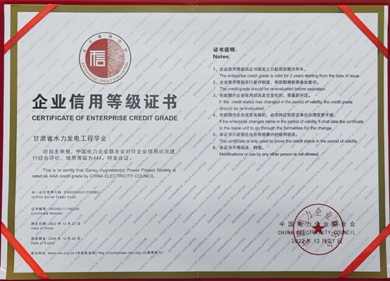 2016年以來,為做大做強學會,更好地服務於社會、各會員單位和個人會員,甘肅省水力發電工程學會在理事會正確領導下,嚴格規範學會各類活動開展,並高度重視信用體係建設工作。經過多年努力,在自評具備了相關評級條件的基礎上,學會於2021年向經國家發改委授權的中國電力企業聯合會提交了參與信用評級申請。