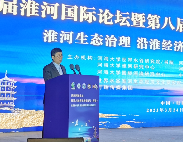 中國工程院院士、河海大學黨委書記、淮河研究中心主任唐洪武在致辭中表示,2021年12月,河海大學世界水穀與盱眙縣聯合成立世界水穀淮河生態經濟文化研究院,助力淮河現代化,打造聚焦淮河流域綠色發展和文化創新的高水平智庫平台和交流合作網絡。此次論壇舉辦,河海大學將繼續強化水教育、水科學世界高地建設、與大家攜手共謀發展,聚智聚力解決淮河流域新老水問題,為國家重大戰略實施和淮河流域經濟社會高質量發展提供有力支撐,為加快譜寫人水和諧淮河新篇章、加快實現中國式現代化做出新的更大貢獻。