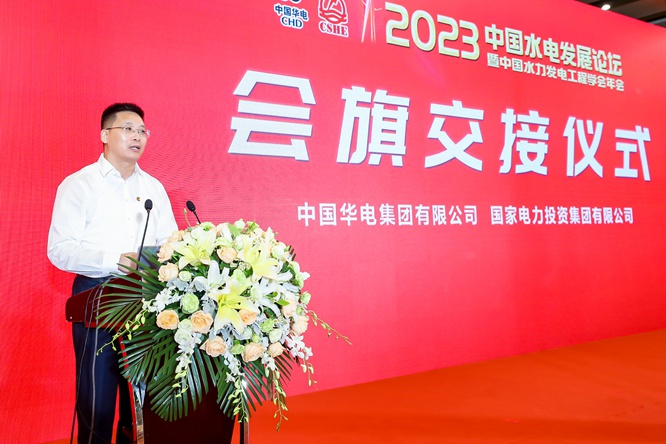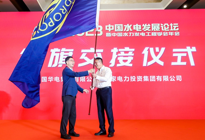 大會開幕式最後舉行了“中國水電會旗”交接儀式,象征著水電事業承前啟後、繼往開來、逐夢前行,廣大水電工作者凝心聚力,為著共同的事業砥礪新征程、譜寫新篇章。2024年中國水電發展論壇將由國家電力投資集團有限公司與水電學會共同主辦,國電投副總經理徐樹彪從中國華電副總經理王緒祥手中鄭重接過會旗並作簡短表態講話。