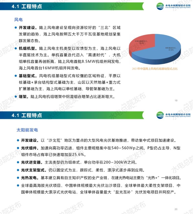 光伏工程特點呈現:以“沙戈荒”地區為重點的大型風電光伏基地推進,帶動集中式項目加速建設;加速向高功率邁進,組件主要規格集中在540~560Wp之間。P型仍占主導,N型組件市場占有率已快速增加至25.6%;光伏逆變器主流類型仍為組串式,單台功率在200~300kW之間;光伏支架型式仍以固定式為主,跟蹤式、柔性、漂浮式逐步得到應用。