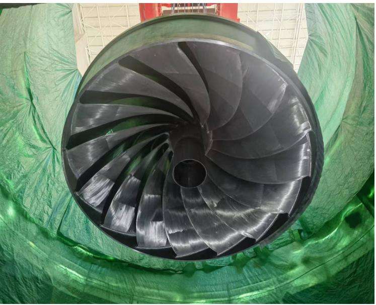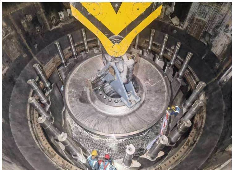 轉輪是將水能轉化為機械能的裝置,決定著水輪機的過流能力、水力效率及機組的運行穩定。本次吊裝的轉輪主要由15個轉輪葉片、上冠、下環等部件組成,為整體吊入機坑內,高度約為3.38米,轉輪直徑為6.2米,整體重量約為114.8噸。