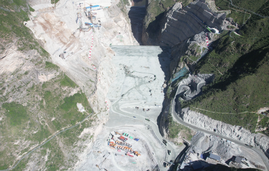 必英溝料場是拉哇水電站唯一料場,料場地形陡峭,最大邊坡高度400米,直立邊坡高度240米,且具有“高、陡、薄、短、缺”五大特點,施工道路布置和壩料開采難度極大。為保障大壩填築高峰期料源供應穩定,項目部以“分層分區開挖、隨層跟進支護”為主要施工方案,多層設置采挖作業麵,合理布置工作線長度,多點麵穿插交替開采,形成鑽爆、挖裝流水作業,全麵保障開采強度;建設中轉料場至料場明線道路,縮短運距50%以上,將交通承載力提升100%,使運輸效率全麵提升,道路維護及運輸成本顯著降低,為世界級工程建設提供堅實料源保障。