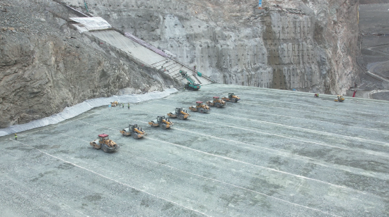 在拉哇水電站大壩工程全麵進入施工高峰期後,項目部不斷優化施工規劃,逐步在超窄河穀內構建起超8.2萬平方米的廣闊作業麵,全麵應用無人碾壓、智能物料、智能加水、智能攤鋪等技術聯動智慧大壩協同指揮平台,全麵提升大壩填築效率與質量,使大壩日填築方量突破3萬方,月填築方量接近100萬方,月上升高度超過13.2米,為目前國內上升速度最快的混凝土麵板堆石壩。