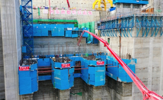 羊曲項目是水電三局首個同時采用滑模工藝和爬模工藝施工的項目。主廠房及安裝間排架柱及剪力牆施工過程中混凝土均采用整體爬升模板進行;副廠房下遊牆和尾水閘墩結構采用滑模施工。“此工藝為液壓係統,自行爬升,施工過程中不需要門機提升,大大降低了垂直起吊設備的工作量,不僅僅提高了作業效率,還減小了相鄰作業麵交叉作業幹擾及安全風險,為機組按節點目標安裝奠定了基礎。”項目經理趙貴成說道。