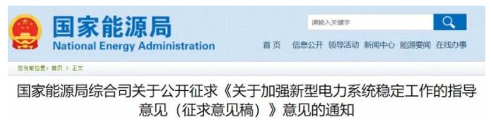 4月24日,國家能源局發布通知,就《關於加強新型電力係統穩定工作的指導意見(征求意見稿)》,向社會公開征求意見。