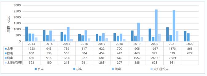 4 核電投資額再創新高2022年,非化石能源發電投資占電源投資比重達到87.7%,比上年下降0.9個百分點。其中,水電投資863億元,同比下降26.5%;核電投資677億元,同比增長25.7%。
